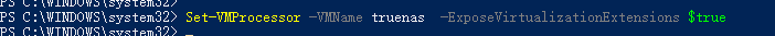 Set-VMProcessor -VMName truenas -ExposeVirtualizationExtensions $true